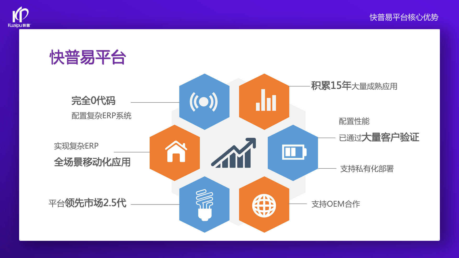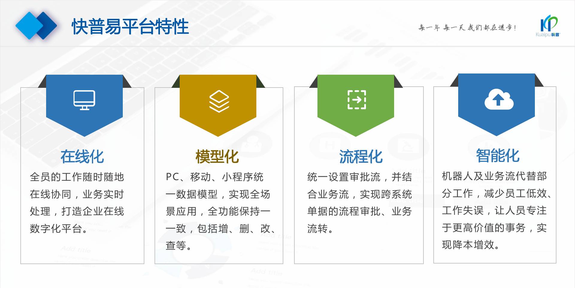 為了解決市場(chǎng)需求與平臺(tái)產(chǎn)品瓶頸等矛盾,實(shí)現(xiàn)徹底的零代碼平臺(tái),快普?qǐng)?jiān)持理念創(chuàng)新,以理念推動(dòng)平臺(tái)技術(shù)的創(chuàng)新?!耙圆蛔儜?yīng)萬(wàn)變”的理念:分析哪些東西未來(lái)肯定不變?哪些趨勢(shì)未來(lái)一定會(huì)變?從變化中找出不變的因素,從不變中找出變動(dòng)的因素;從量變到質(zhì)變,經(jīng)歷萬(wàn)變總結(jié)抽象出不變的本質(zhì)?;诳炱臻L(zhǎng)期的信息化服務(wù)經(jīng)驗(yàn),開(kāi)發(fā)配置出企業(yè)數(shù)字化轉(zhuǎn)型工具:快普易平臺(tái)成功解決了企業(yè)數(shù)字化轉(zhuǎn)型升級(jí)面臨的客戶大量個(gè)性化需求,真正實(shí)現(xiàn)隨需而變的設(shè)計(jì)理念,大大降低了信息化投入成本,提高信息化效率,幫助企業(yè)實(shí)現(xiàn)自主可控的技術(shù)創(chuàng)新,從而進(jìn)一步推動(dòng)企業(yè)的業(yè)務(wù)創(chuàng)新和管理創(chuàng)新。
